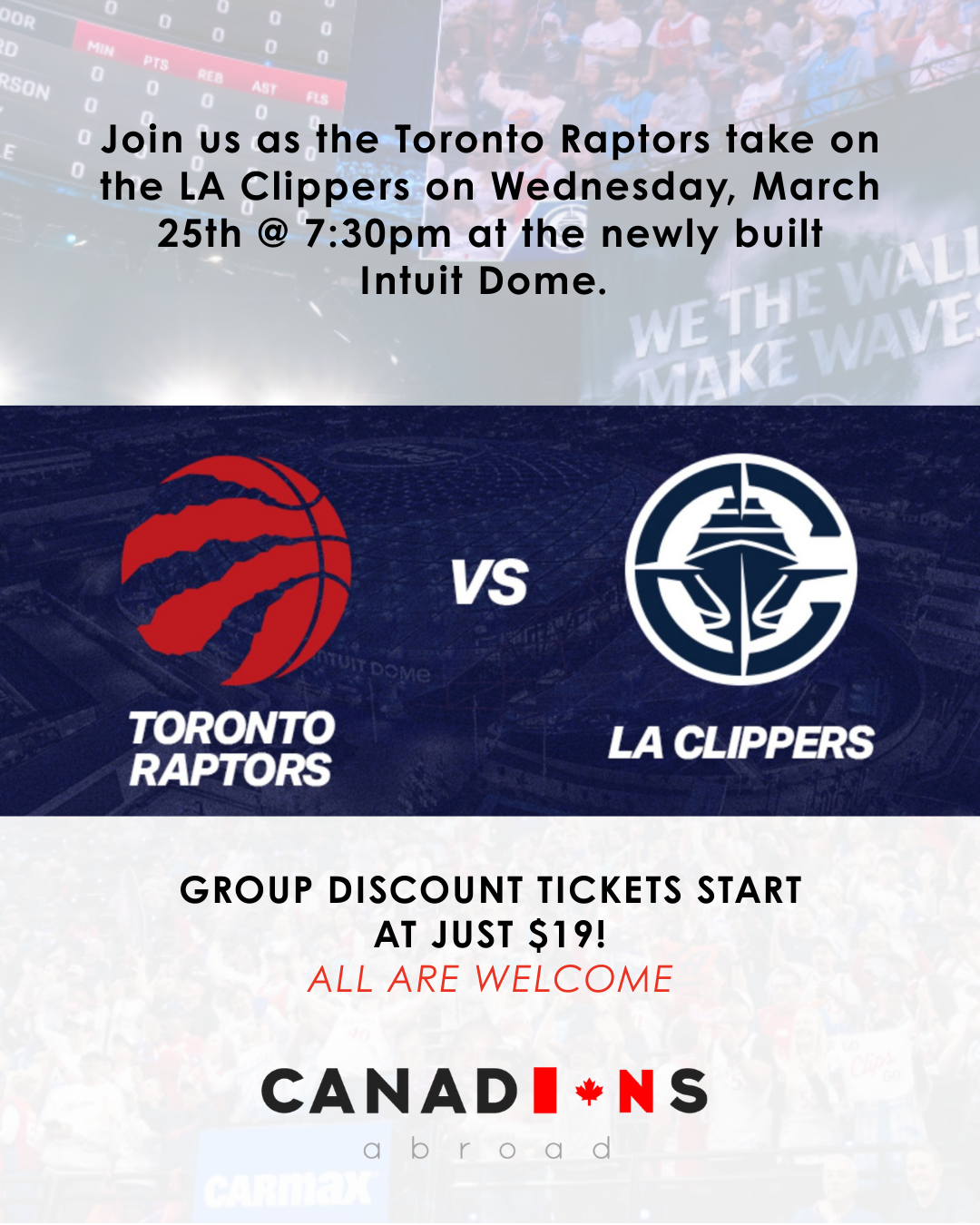 We're kicking off the New Year with a great event! Join us as the Toronto Raptors take on the LA Clippers on Wednesday, March 25th @ 7:30pm at the newly built Intuit Dome.